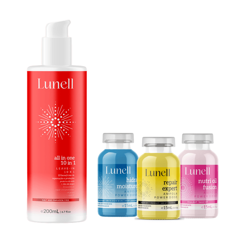 O Kit Cronograma Capilar Lunell + Leave-in 10x1 All in One foi desenvolvido para oferecer um tratamento completo e resultados profissionais no conforto da sua casa.